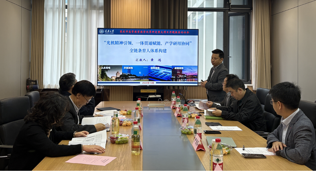 2025年10月24日,在科学城校区虎溪校园信息大楼B316会议室,光电工程学院组织开展重庆市高等教育教学改革研究重大项目开题论证会。会议邀请曾孝平、文俊浩、郭永彩三位专家莅临指导,学院黄鸿教授作为项目负责人进行开题汇报,项目组部分成员、学院部分教学管理人员参会。