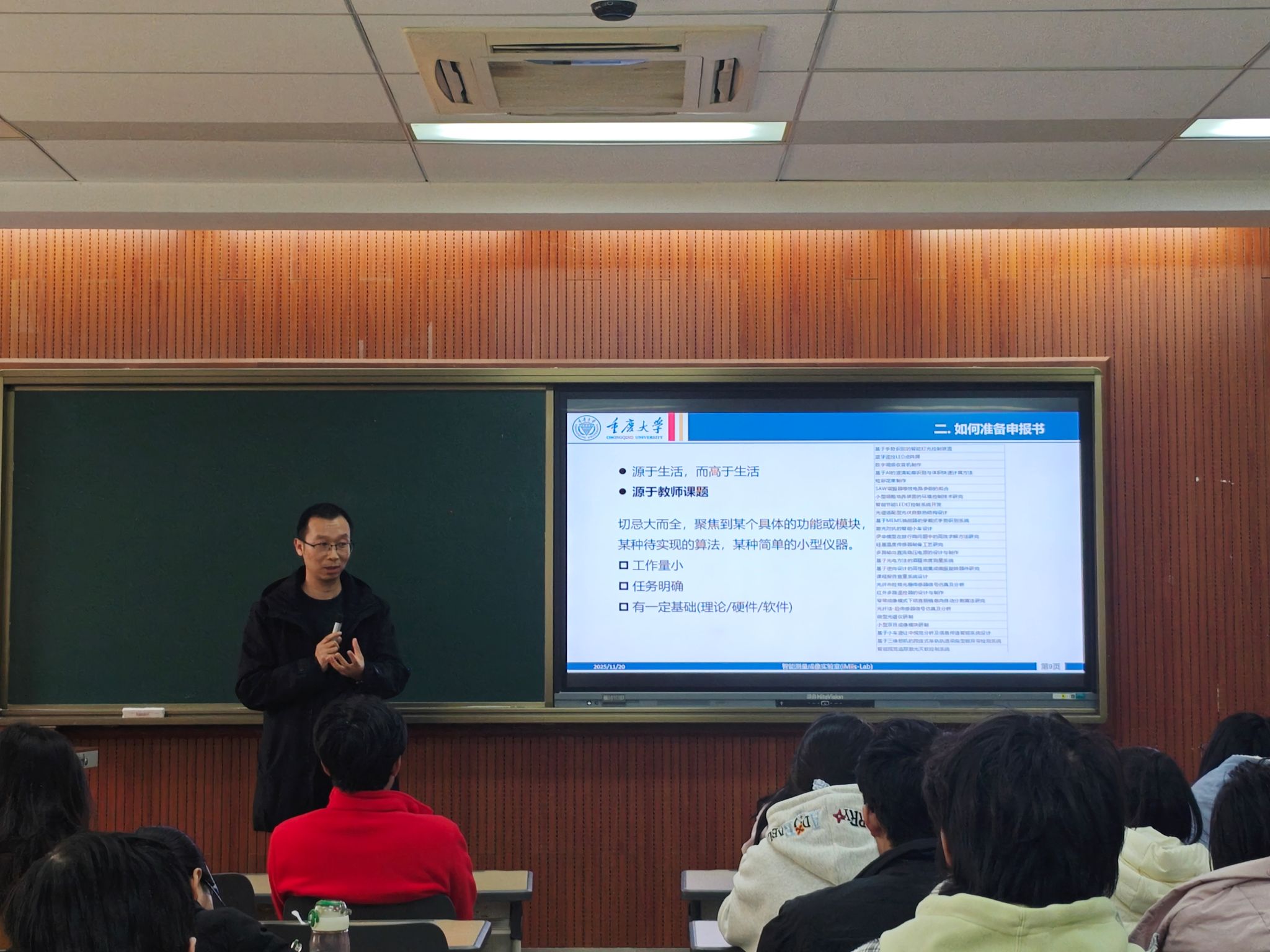 为系统推进学生科研创新能力培养,重庆大学光电工程学院学生创新中心于2025年11月20日下午4点30分,在科学城校区D1207教室开展国创创新项目申报专项辅导活动。作为学院学生创新中心“学生科研能力提升系列活动”的重要一环,本次活动特别邀请智能测量成像研究室冯鹏副教授及往届国创优秀项目获奖者梁宏明同学,为本科生搭建国家级、省市级大学生创新创业训练计划的申报桥梁。