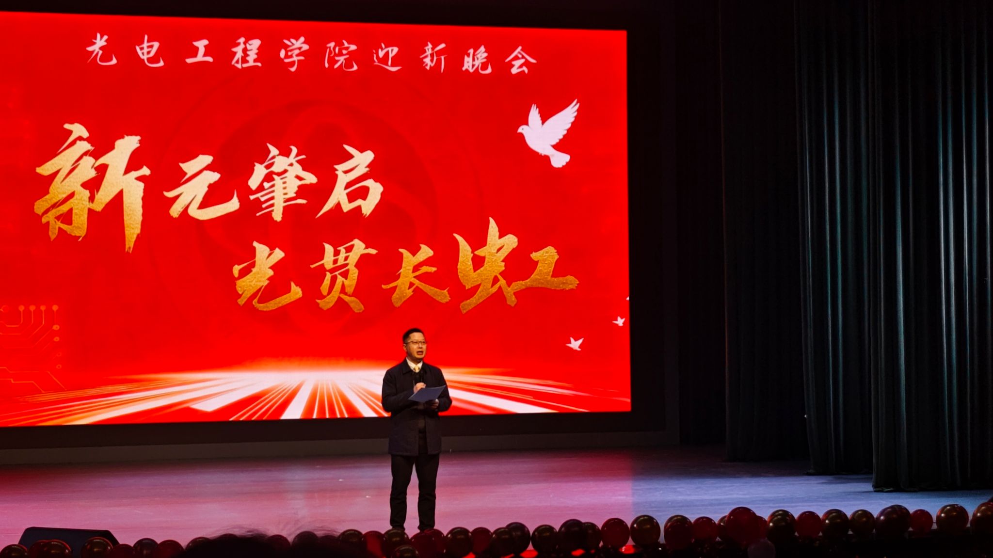 12月11日,光电工程学院在虎溪校园小剧场举办了第三届才艺展演暨“新元肇启、光贯长虹”2026年迎新晚会。学院党委书记熊辉,党委副书记、纪委书记刘俊,副院长黄鸿、韦玮和学院师生们一同参加了本次活动。