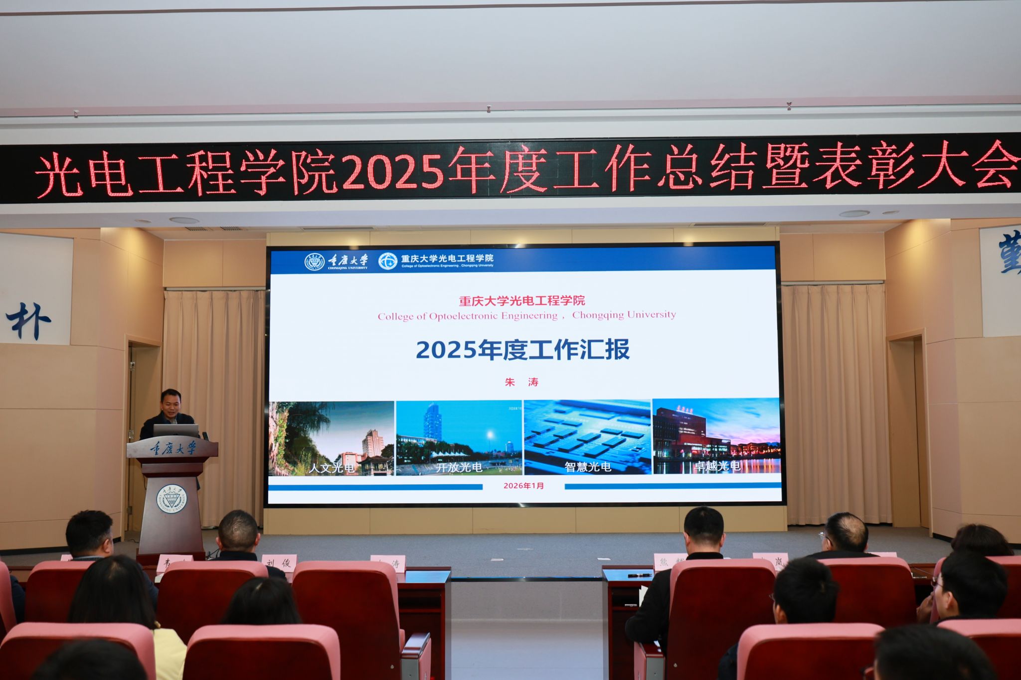 随后,朱涛院长代表学院作2025年度工作汇报。报告系统回顾了过去一年学院在党建引领、队伍建设、人才培养、科学研究、合作交流等方面取得的成绩与突破,深刻剖析了当前面临的机遇与挑战,并详细阐述了学院“一二三四五六”发展实施方案。朱涛表示,学院将继续坚持“1+1远大于2”的协同发展理念,积极携手兄弟学院,持续深化在学科交叉融合、科研平台共建、重大项目联合攻关等方面的务实合作,以光电人特有的担当与作为,全力助推学校 “双一流” 建设战略扎实落地、取得实效!