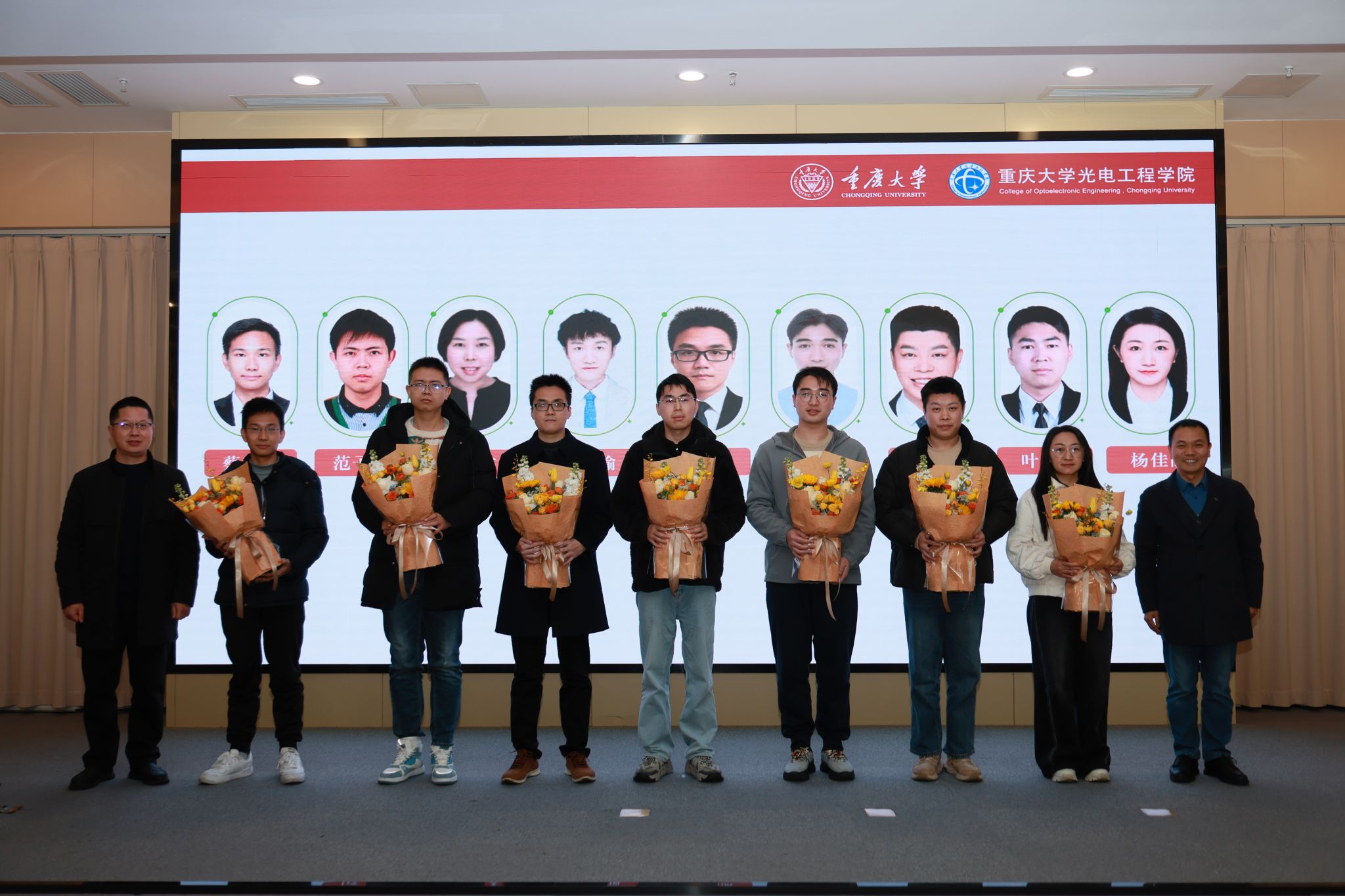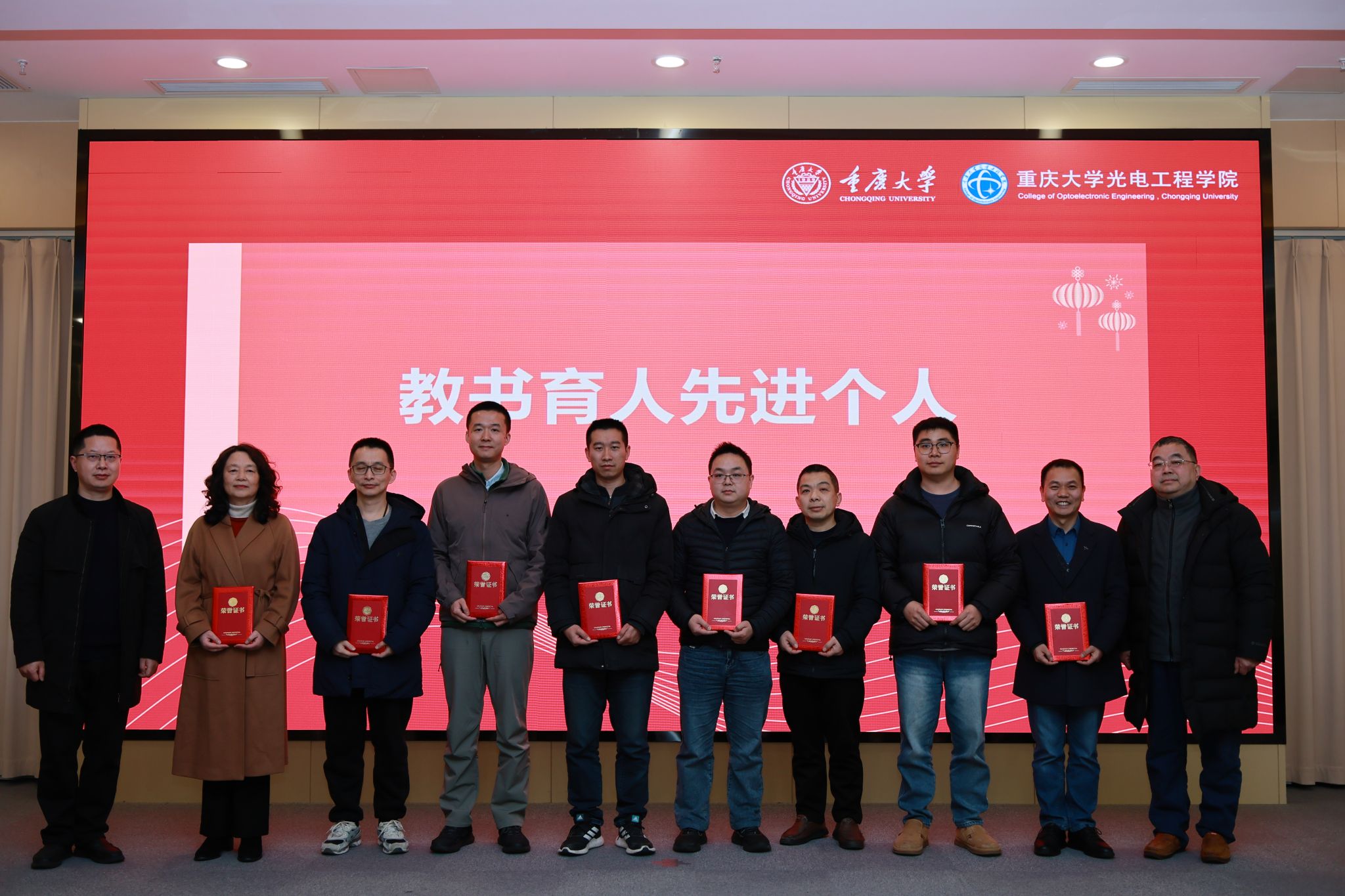 大会对2025年度涌现出的先进个人与优秀团队进行了隆重表彰。颁奖嘉宾依次为获奖的先进个人和优秀团队师生代表颁发荣誉证书。过去一年,他们践行“艰苦奋斗、团结协作、努力拼搏、勇攀高峰”的“光机精神”,在各自的岗位、学业上取得了突出成绩,展现了光电师生昂扬向上、追求卓越的精神风貌。