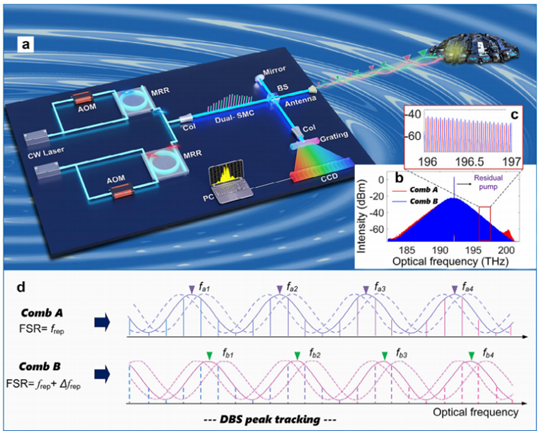 针对以上问题,研究团队提出了一种基于双光梳呼吸光谱(DBS)的新型精密LiDAR(图1a)。光谱的振荡部分及其随距离的趋势如图1d所示,类似于呼吸模式,因此称为呼吸光谱。