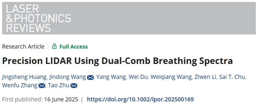 相关研究成果以“Precision LIDAR Using Dual-Comb Breathing Spectra”为题发表在Laser & Photonics Reviews期刊。重庆大学博士研究生黄景晟(现就职于中国石油安全与环境技术研究院),重庆大学光电工程学院副教授王金栋、博士研究生杜伟,西安光机所助理研究员王阳为论文的共同第一作者;重庆大学光电工程学院副教授王金栋、教授朱涛,以及西安光机所张文富研究员为通讯作者;陕西科技大学王伟强教授、重庆大学光电工程学院硕士研究生李子文参与了实验工作,合作者还包括香港城市大学Sai Tak Chu教授。