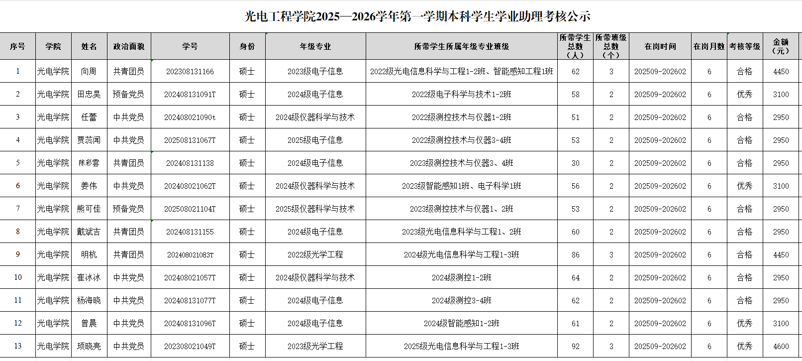 根据学校《关于开展2025- 2026学年第一学期本科学生学业助理考核工作的通知》,经班级评定、辅导员评价、学院审核,现将光电学院2025—2026学年第一学期本科学生学业助理考核情况公示如下: