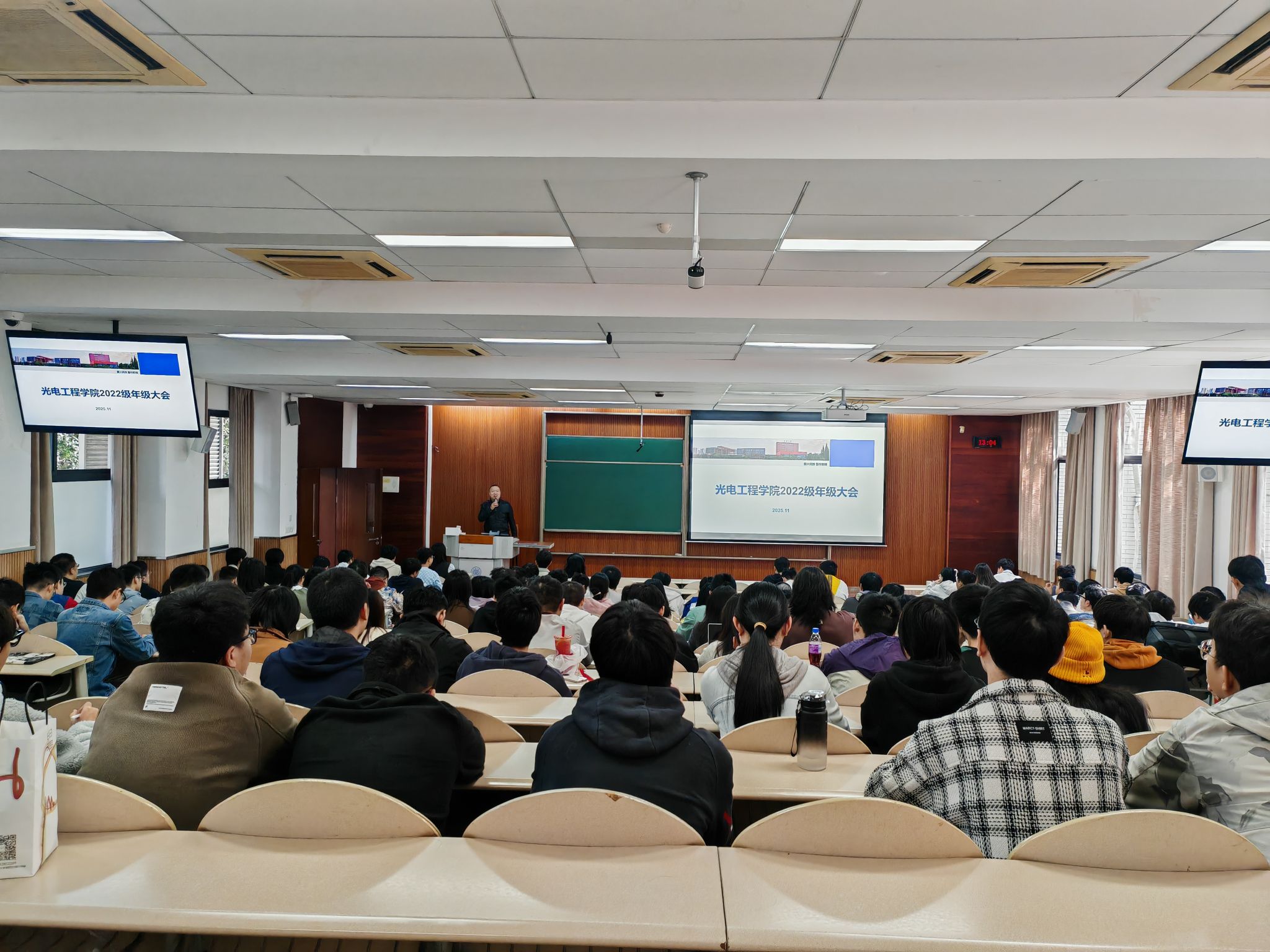 为帮助2022级本科生明晰发展方向,2025年11月4日下午13:00,光电工程学院2022级年级大会在虎溪校区第一教学楼D1131召开。会议由本科2022级辅导员陈涛主持,光电学院党委副书记刘俊、本科2022级全体本科生参加。